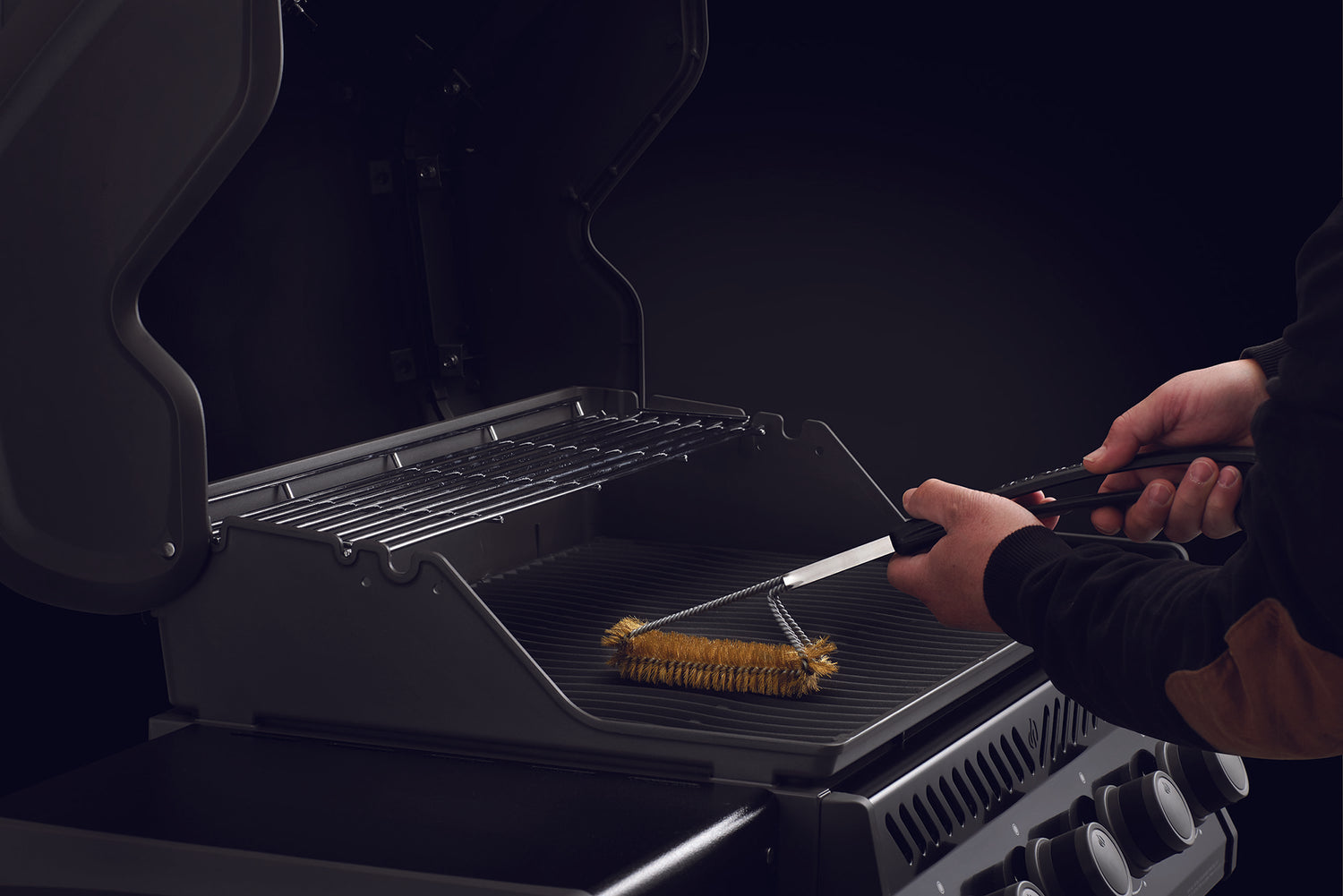 - Käytä Napoleonin puhdistusharjaa valurautaisten paistopintojen puhdistamiseen. Tämä puhdistusharja soveltuu täydellisesti valurautapintojen perusteelliseen puhdistamiseen. Harjan pitkä varsi lämpöä kestävällä kahvalla suojaa käsiä puhdistettaessa kuumaa grilliä. Puhdista grillin paistopinnat niiden ollessa vielä lämpimät. Pitkän varren toisessa päässä koukku ripustusta varten. Muista, puhdas grilli on onnellinen grilli!