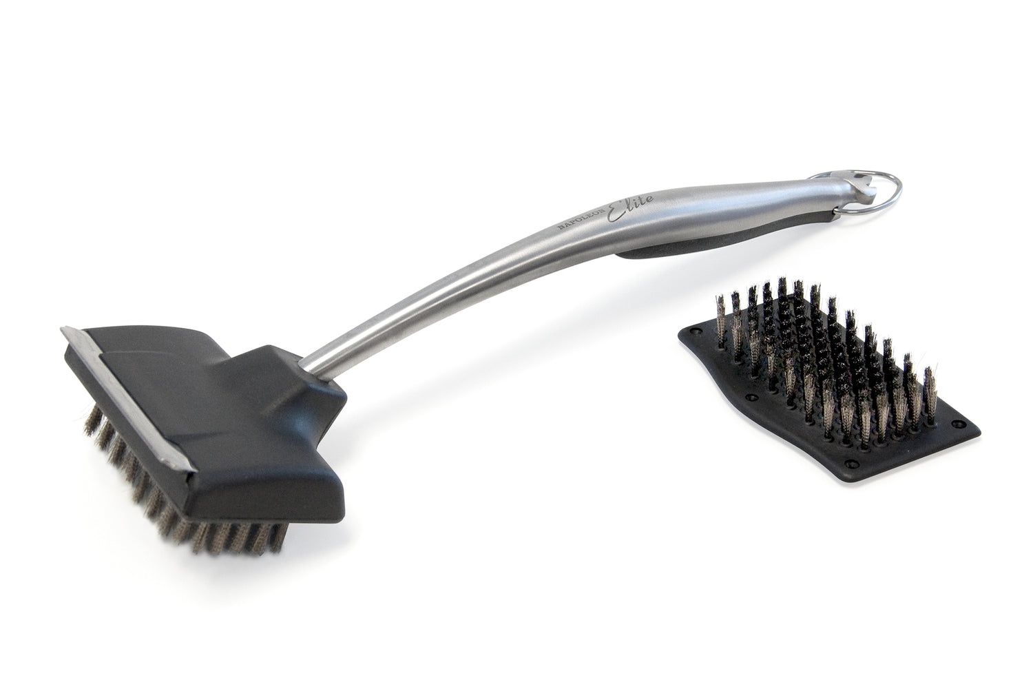 Napoleon PRO puhdistusharjassa on vaihdettava harjaspää, jonka etupuolella on metallikaavin erityisen hankalia puhdistuskohtia varten. Harjapää ja ergonominen runko ruostumatonta terästä. Varren toisessa päässä pullonavaaja ja koukku ripustusta varten.
