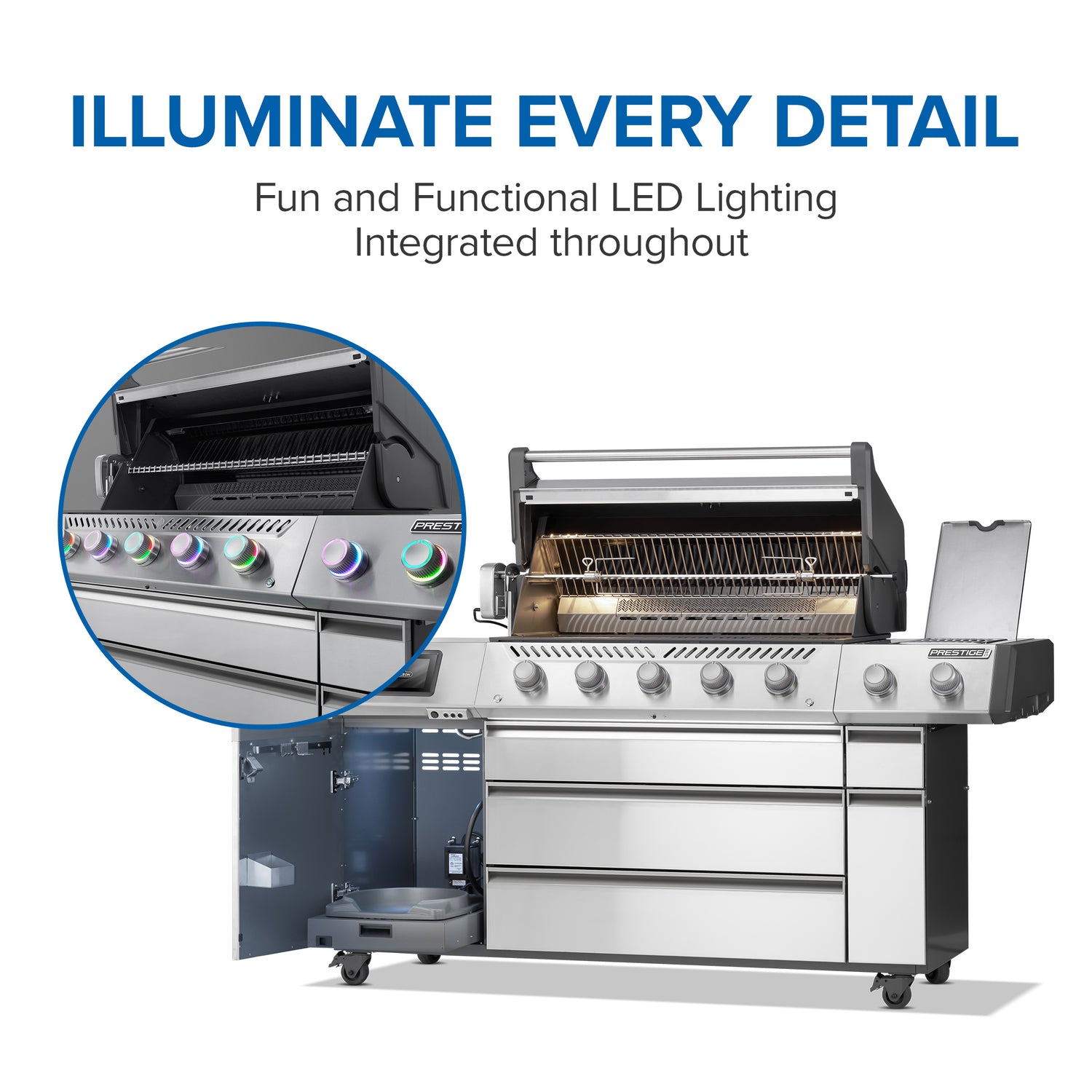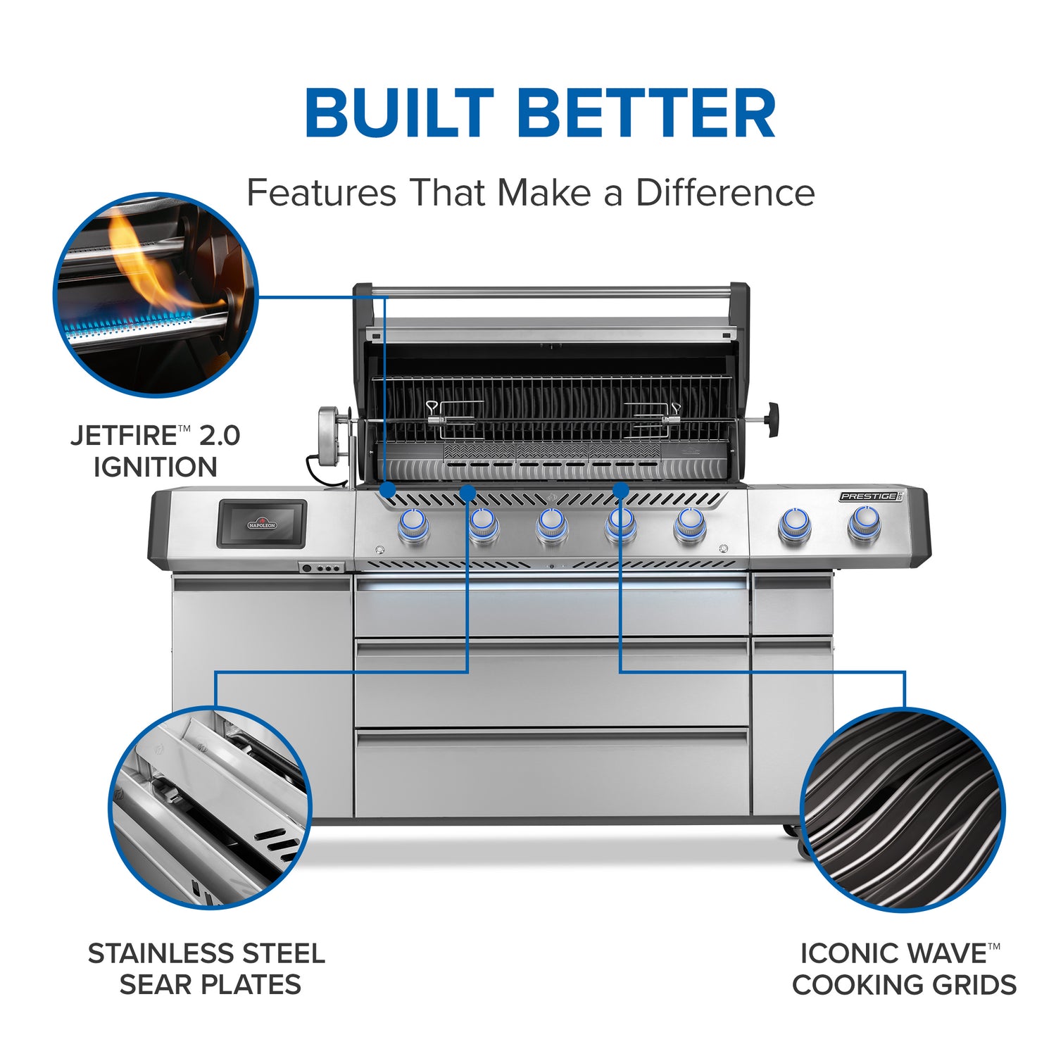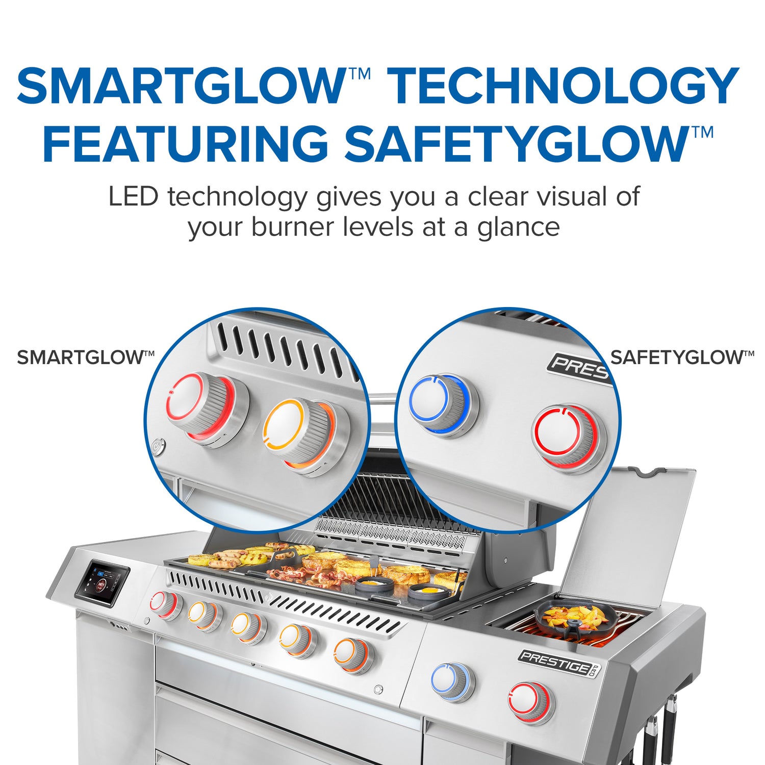 Napoleon Prestige Pro Connected -grillit yhdistävät huippuluokan materiaalit, tasaisen lämmönjaon ja älyteknologian, jotka nostavat grillauskokemuksen aivan uudelle tasolle. Ruostumattomasta teräksestä valmistetut pohjapolttimot syttyvät luotettavalla JETFIRE 2.0 -järjestelmällä, ja lämpöä ohjataan SMART GLOW -taustavalaistuilla säätönupeilla, joiden väri kertoo lämpötilan, ja joita voi säätää tunnelman mukaan. Polttimot on varustettu liekinvarmistimilla turvallisuuden lisäämiseksi.