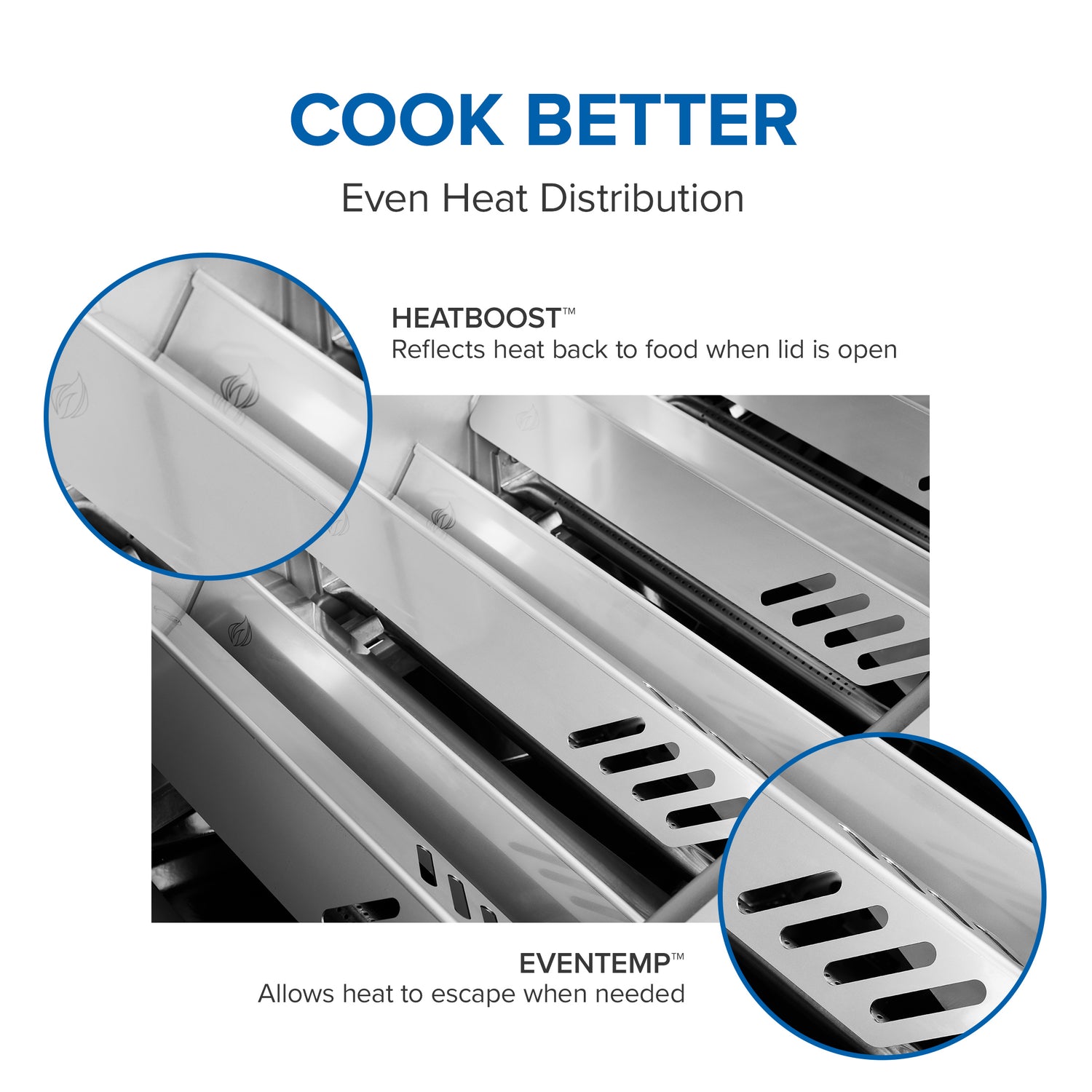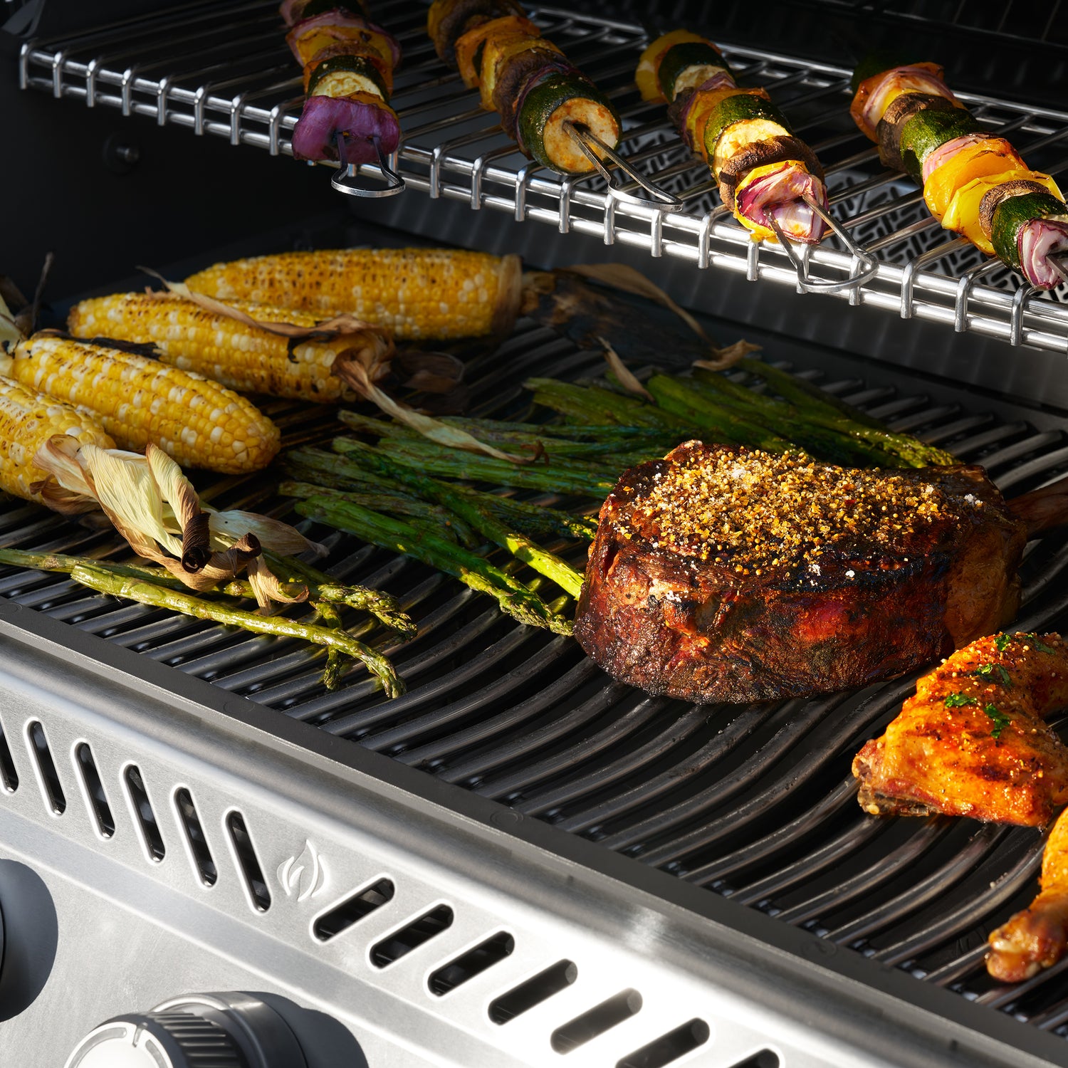 Grillin paistopinta koostuu 9,5 mm paksuista ruostumattomista WAVE -ritilöistä, jotka jakavat lämmön tasaisesti ja tuottavat näyttävät grillausjäljet. Kaksitasoiset ruskistuslevyt tasaavat lämpöä ja höyrystävät tippuvat nesteet takaisin ruokaan lisäten mehukkuutta. Muotoon valettu alumiininen tulipesä on kestävä ja helppo puhdistaa. Yläpuolella oleva monitoiminen lämpöritilä taittuu pois tieltä, kun sitä ei tarvita.