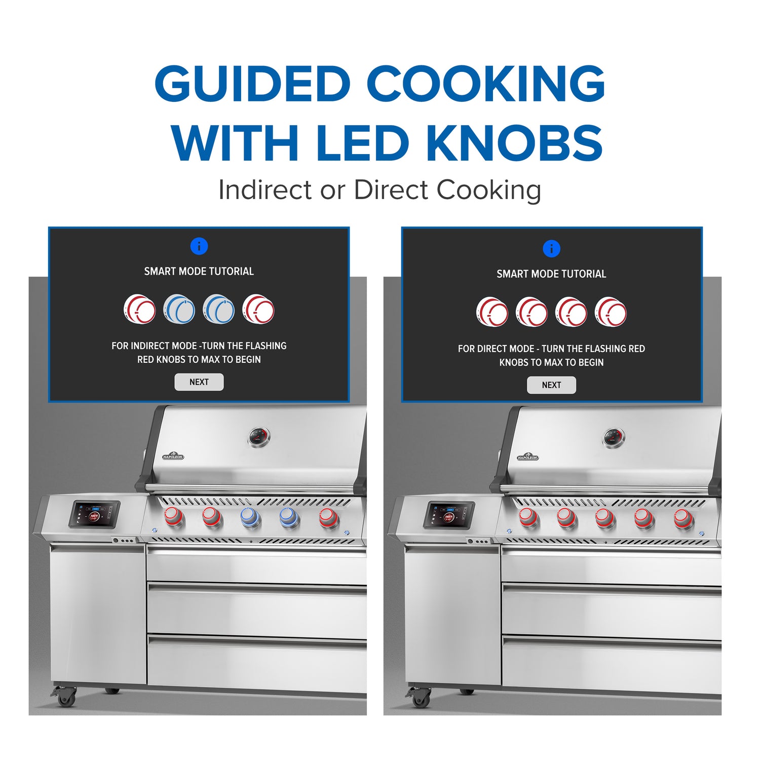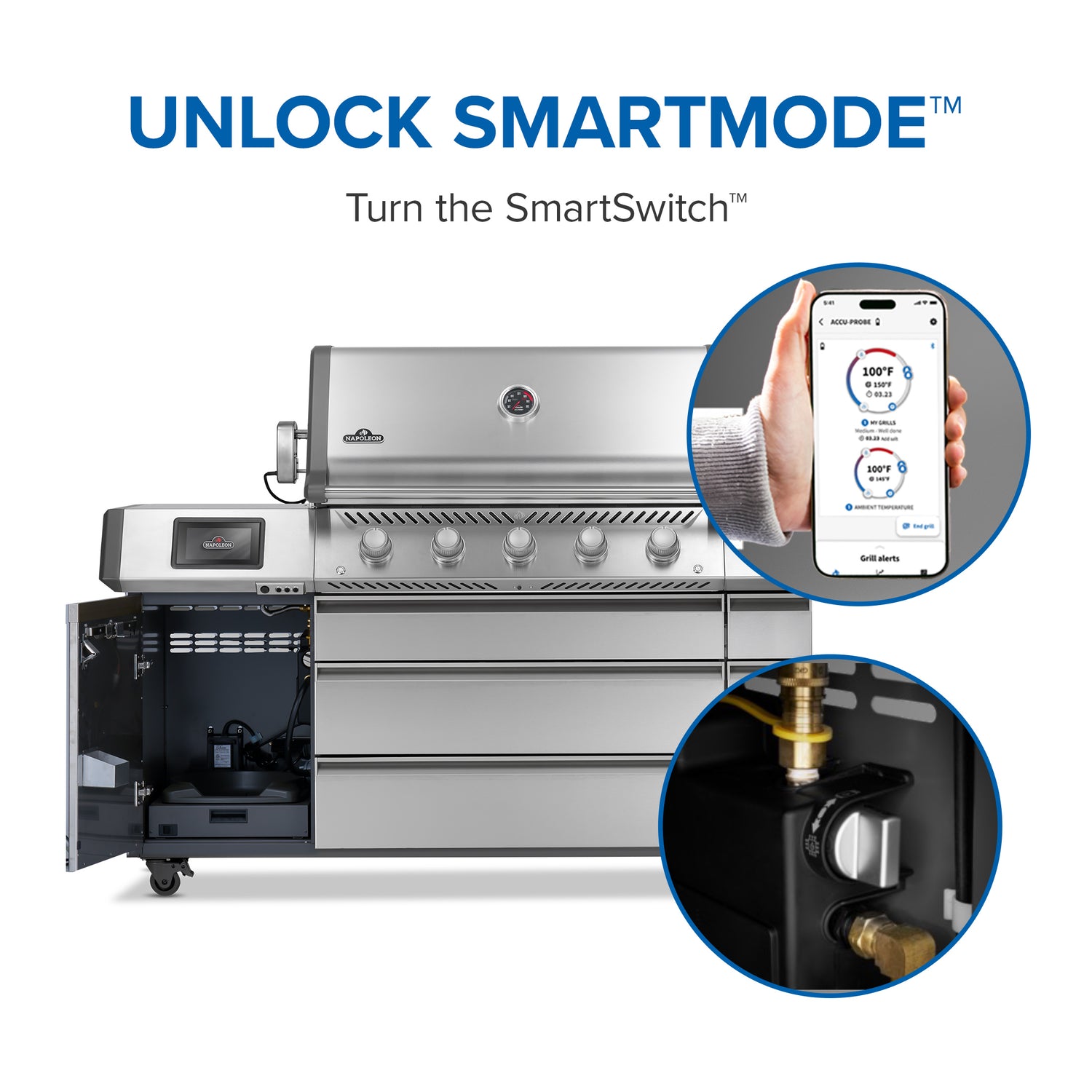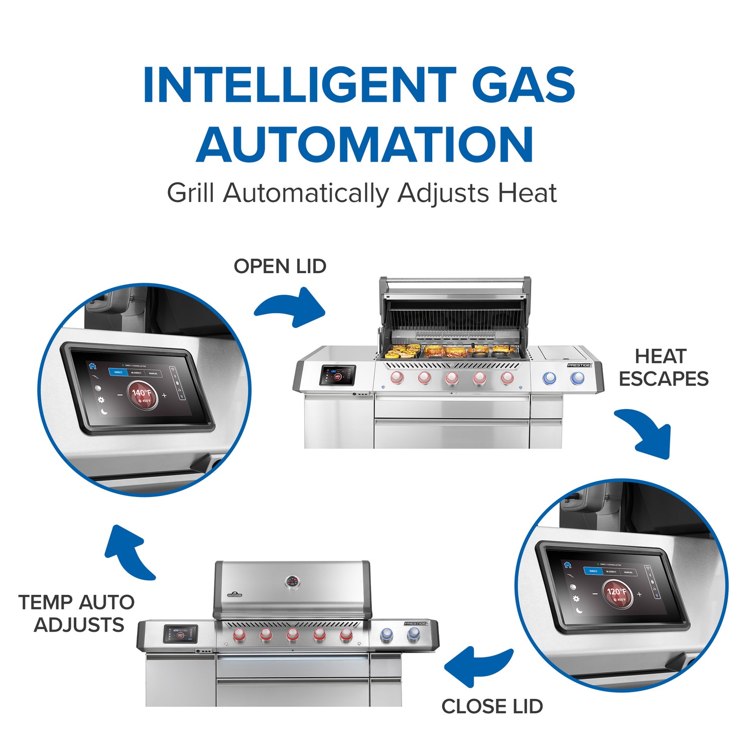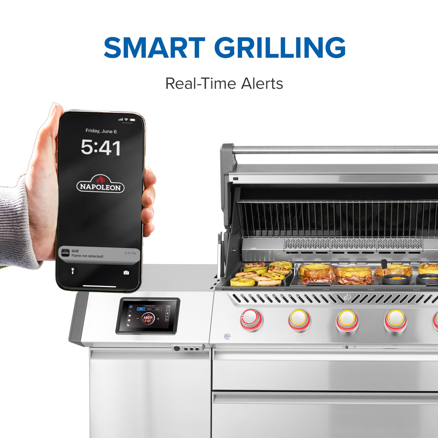 Grillin 7" kosketusnäyttö mahdollistaa automaattisen lämmönsäädön ja selkeän ohjauksen. Napoleon Home -sovellukseen yhdistettynä voit seurata lämpötiloja, ajastuksia ja hälytyksiä puhelimestasi. Grillin sivutasoon integroitu LCD-näyttö näyttää kaikki tärkeät tiedot yhdellä silmäyksellä, ja mukana toimitetaan kolme lämpötila-anturia (lisävarusteena kaksi langatonta PRO X -anturia)