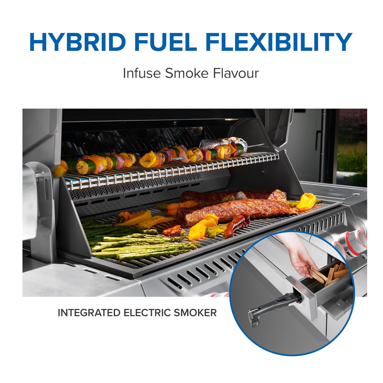 Korkea LIFT EASE -kupu avautuu kevyesti ja säilyttää lämmön tehokkaasti. Kaksinkertainen ruostumaton teräs suojaa kupua värjäytymiseltä ja toimii eristeenä myös talvigrillauksessa. ACCU-PROBE -lämpömittari ja sisävalaistus helpottavat käyttöä hämärässä. Infrapunainen takapoltin mahdollistaa tasaisen varrasruoan kypsennyksen.