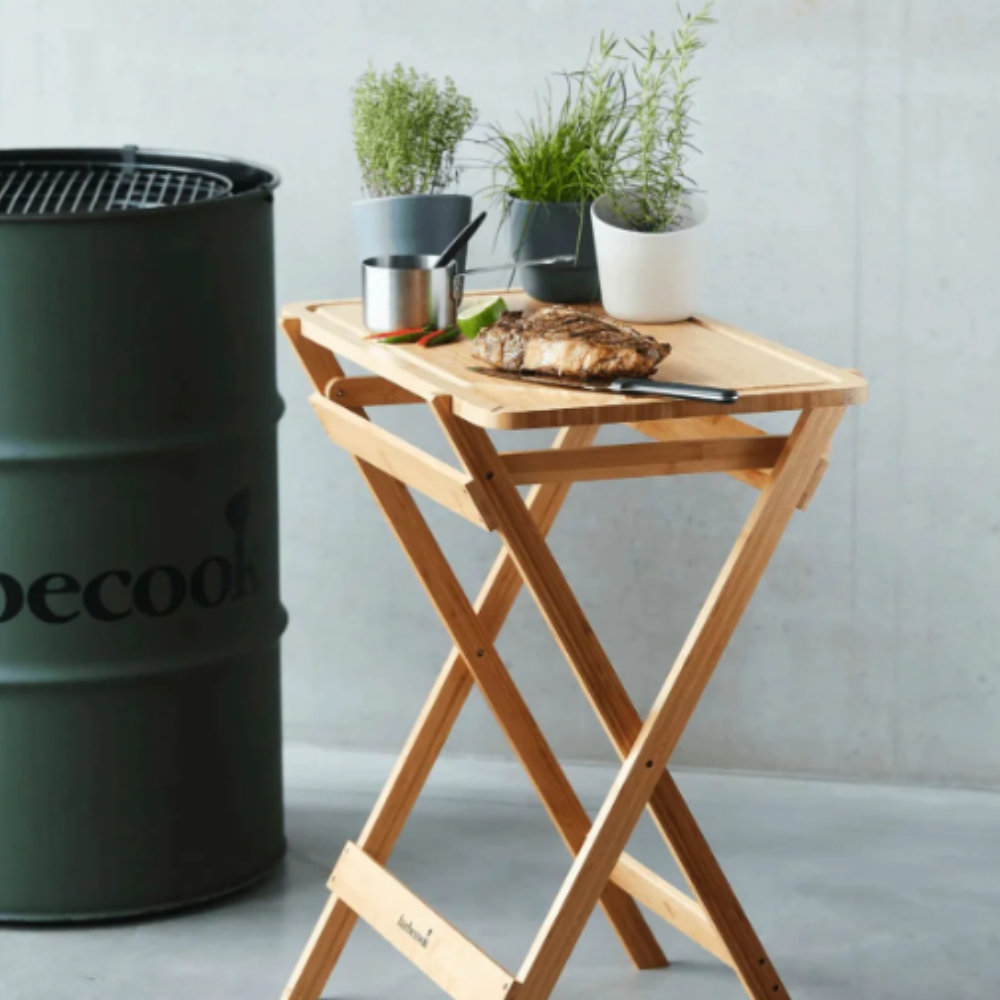 Ainesosien pilkkominen on helppoa Barbecookin käytännöllisellä leikkuupöydällä. Pöydässä on bamburunko ja irrotettava bambuleikkuulauta, jota voi käyttää sekä pöydän päällä että erikseen. Korkeus on 81cm.