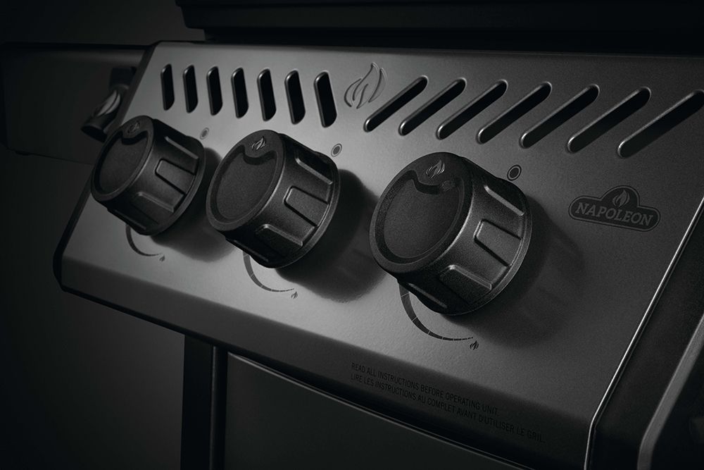 F365-grillin grafiitinharmaassa, kestävässä kuvussa on helposti luettava tarkka lämpömittari, jossa Celsius ja Fahrenheit lämpötilat. Napoleon F365-grillin kestävässä tulipesässä on kolme tehokasta poltinta, sekä yksitasoinen lämmöntasausjärjestelmä, joka vie grillauksen aivan uudelle tasolle, tarjoillen lämpöä korkealta ja kovaa tai hitaasti ja pehmeästi aina kulloisenkin tarpeen mukaan.