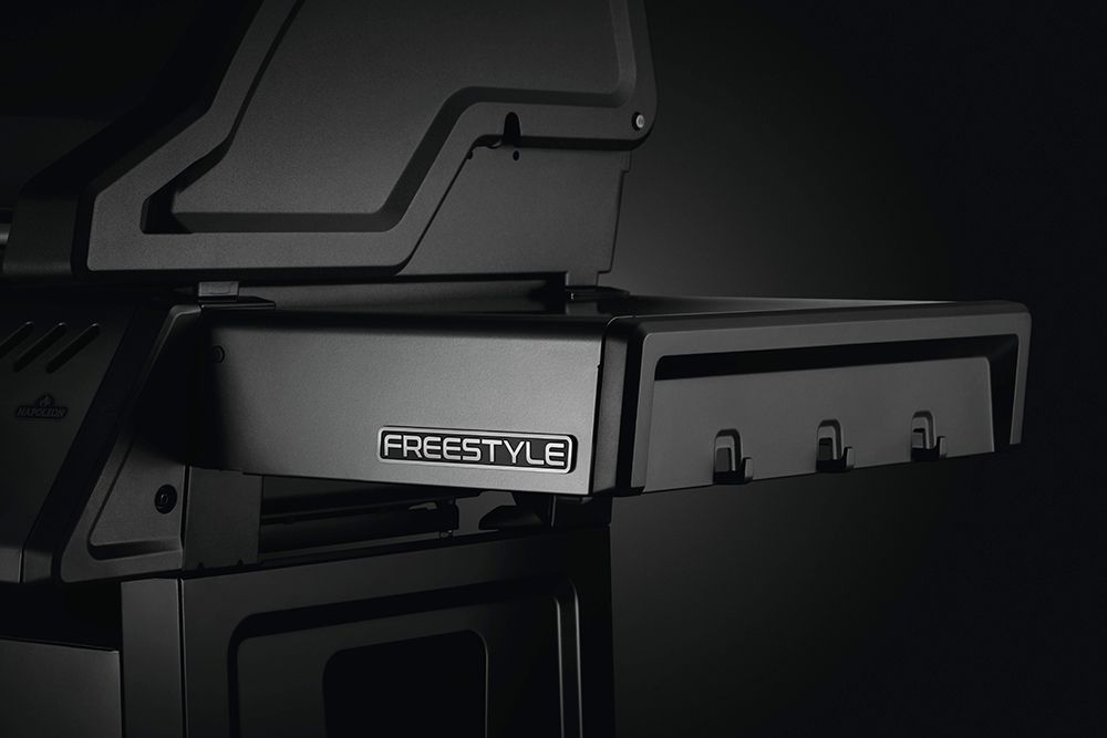 Freestyle® F365:n grillivaunu seisoo tukevasti jalustallaan ja etupanelin takana on säilytystila kaasupullolle, kun grilli ei ole käytössä. Grillivaunun molemmat sivupöydät taittuvat alas runkoon, säästäen tilaa säilytyksessä ja helpottaen sopivan sijoituspaikan löytymistä. Sulavalinjaiset grafiitinharmaat sivupöydät ja niiden pyöristetyt kovamuovista valmistetut päädyt kätkevät uumeniinsa tarvikekoukut grillausvälineille. Sivupöytien sileä pinta on helppo pitää puhtaana ja toisessa pöydässä on pullonavaaja. Grilliä on helppo liikutella sen kahden ison pyörän ansiosta.