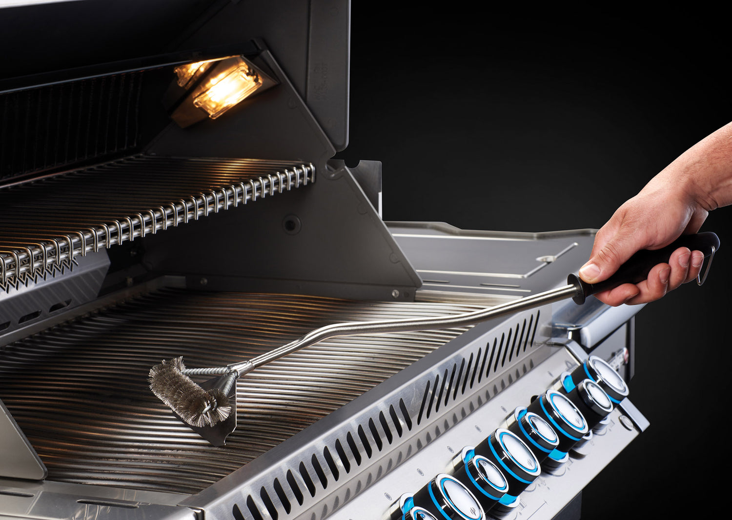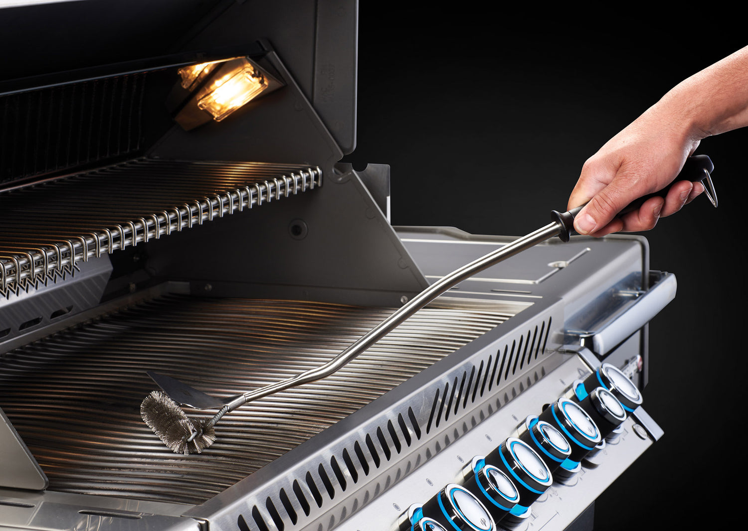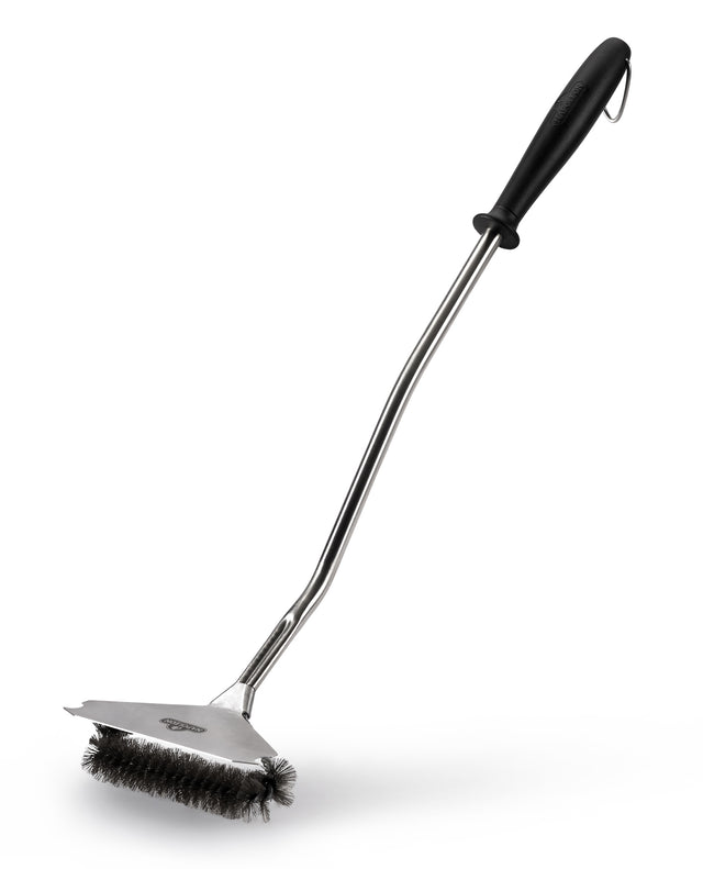 - Käytä Napoleonin Super WAVE puhdistusharjaa ruostumattomasta teräksestä valmistettujen paistopintojen puhdistamiseen. Tämä puhdistusharja soveltuu täydellisesti rosteristen avo- ja umpipaistopintojen perusteelliseen puhdistamiseen. Harjan pitkä varsi lämpöä kestävällä kahvalla suojaa käsiä puhdistettaessa kuumaa grilliä. Rosteriharjaspään päällä on iso kaavin, jolla pääset puhdistamaan avo- ja umpiparilan reunamat. Puhdista grillin paistopinnat niiden ollessa vielä lämpimät. Pitkän varren toisessa päässä koukku ripustusta varten. Muista, puhdas grilli on onnellinen grilli!