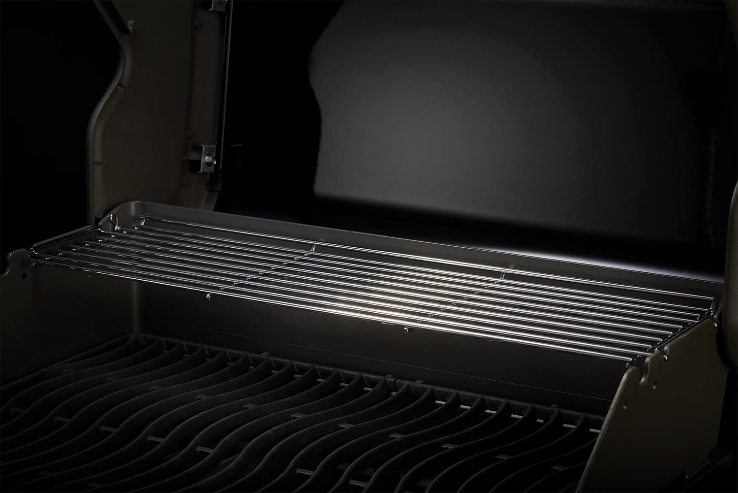 Paistopinnan yläpuolella olevaa lämmitysritilää käytät esimerkiksi pitempää kypsymistä vaativille ruoille ja se antaa tarvittaessa lisätilaa ruokien lämpimänä pitämiseen. Tuplakuorinen ruostumattomasta teräksestä valmistettu grillikupu heijastaa lämpöä takaisin paistopinnalle, sekä suojaa kuvun päällimmäisen kuoren korkeasta lämpötilasta aiheutuvaa värjäytymistä.