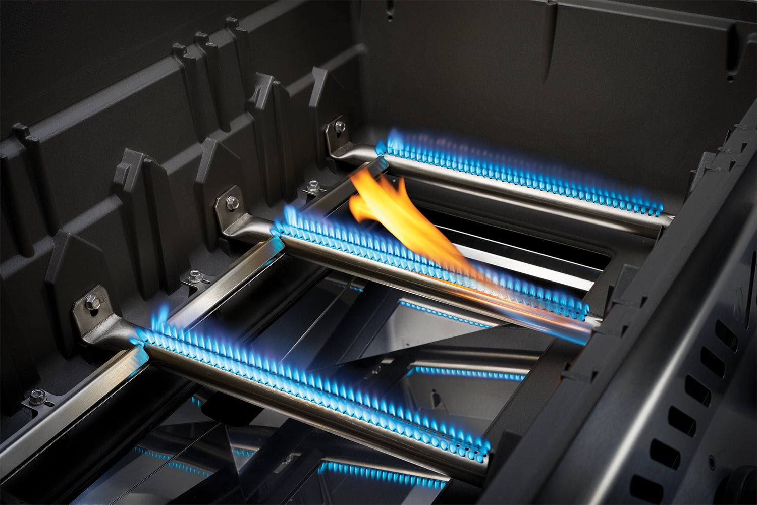 Rogue PRO S-grillien tehokas grillausjärjestelmä koostuu ruostumattomasta teräksestä valmistetuista pohjapolttimoista, jotka sytytetään varmatoimisella JETFIRE™-sytytysjärjestelmällä. JETFIRE™-sytytysjärjestelmä on integroitu jokaiseen säätönuppiin, joten voit sytyttää polttimot itsenäisesti. Säätönupeissa on taustavalaistus helpottamaan grillaamista hämärässä. Polttimoiden päälle sijoitetut kaksitasoiset ruostumattomasta teräksestä valmistetut ruskistuslevyt tasaavat lämpöä paistopinnalle ja suojaavat polttimoita paistopinnalta tippuvilta nesteiltä. Grillauksen aikana ruoasta tippuvat nesteet ja rasva osuvat levyille, jolloin nesteet höyrystyvät palaten takaisin kohti kypsennettävää ruokaa lisäten sen pintaan kosteutta sen pintaan ja siten myös mehukkuutta.