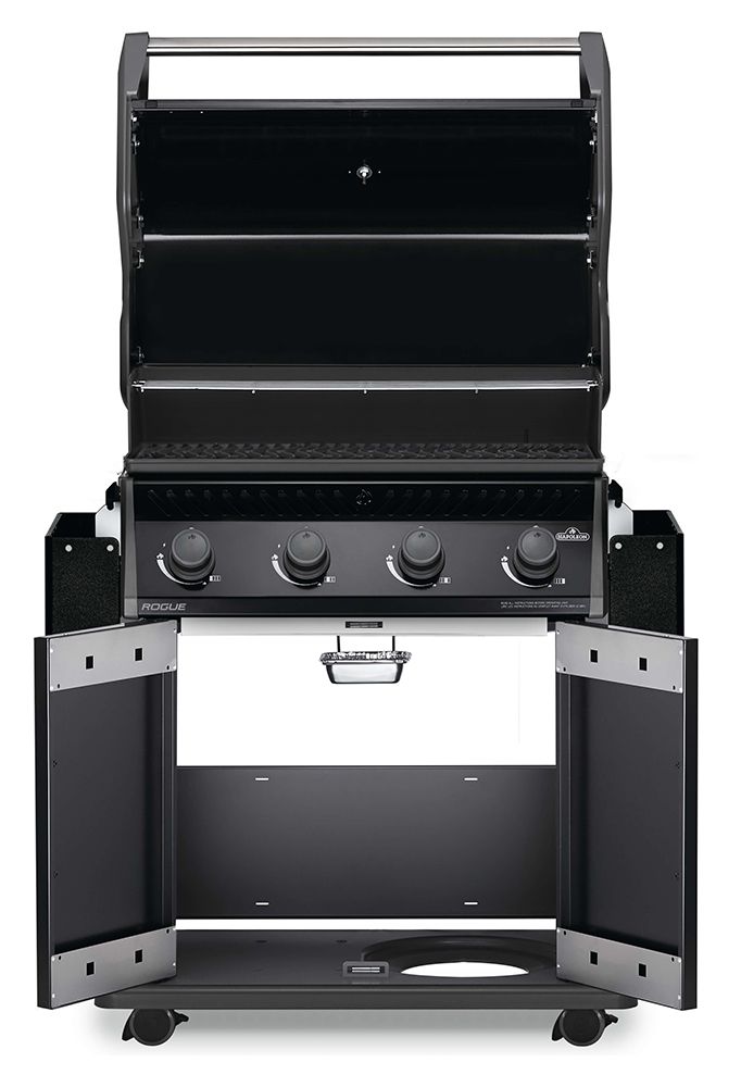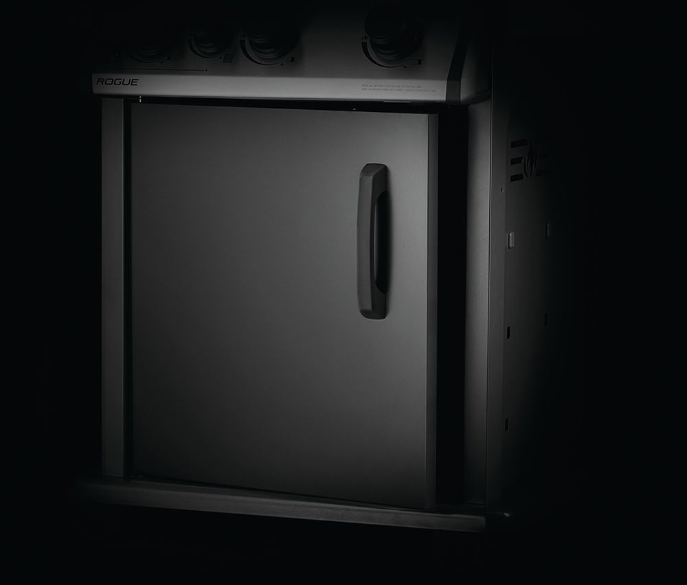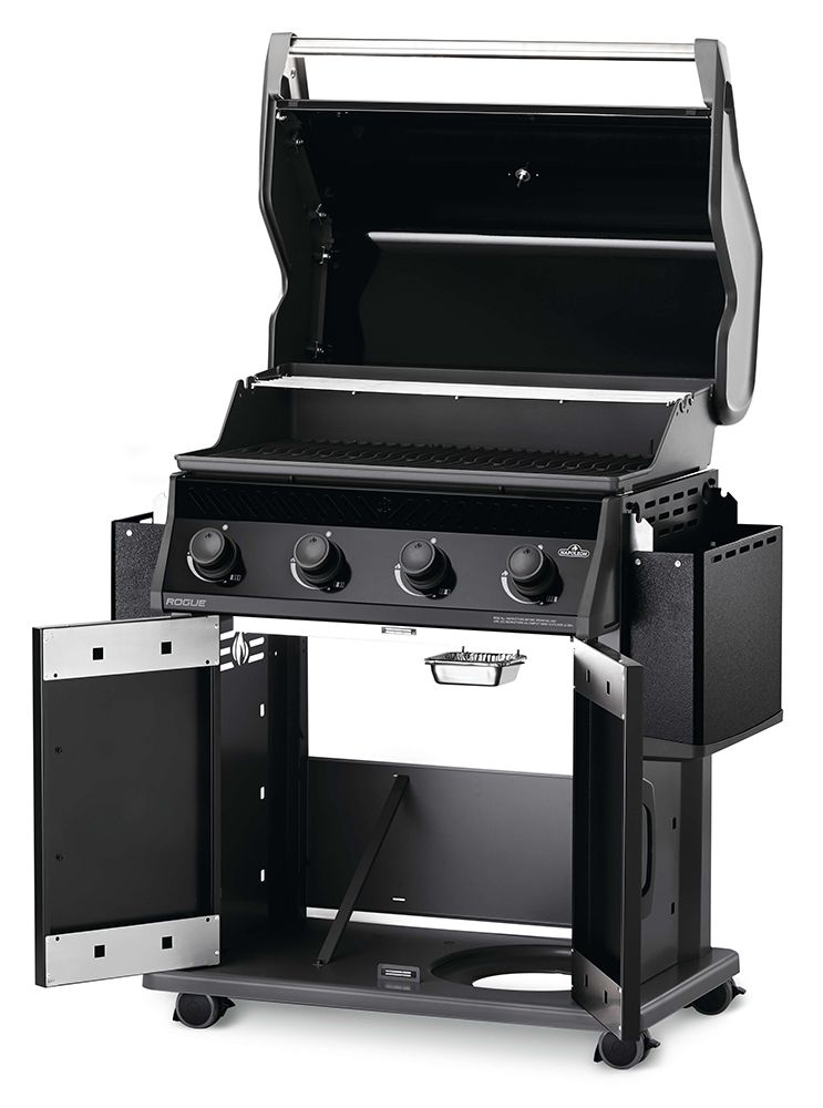 ROGUE® R525-1 grillivaunu seisoo tukevasti pedestaalijalustalla ja siinä on tilava kaapisto magneettilukitteisilla ovilla. Ovien takana on säilytys tilaa kaikenlaisille tarvikkeille, myös kaasupullolle katseilta suojassa. Grillivaunun molemmat sivupöydät taittuvat alas runkoon, säästäen tilaa säilytyksessä ja helpottaen sopivan sijoituspaikan löytymistä. Grilliä on helppo liikutella sen neljän lukittavan pyörän ansiosta.
