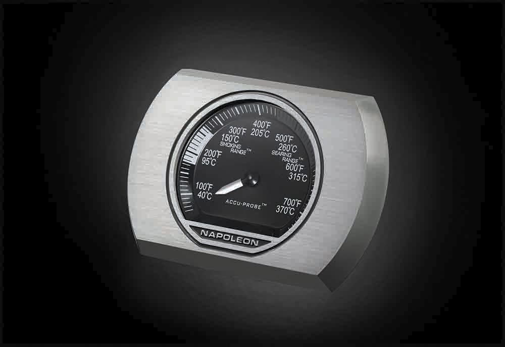 Mustanpuhuvan ROGUE® 525-1 grillin kestävässä kuvussa on helposti luettava ja tarkka ACCU-PROBE™- lämpömittari, jossa Celsius ja Fahrenheit lämpötilat.